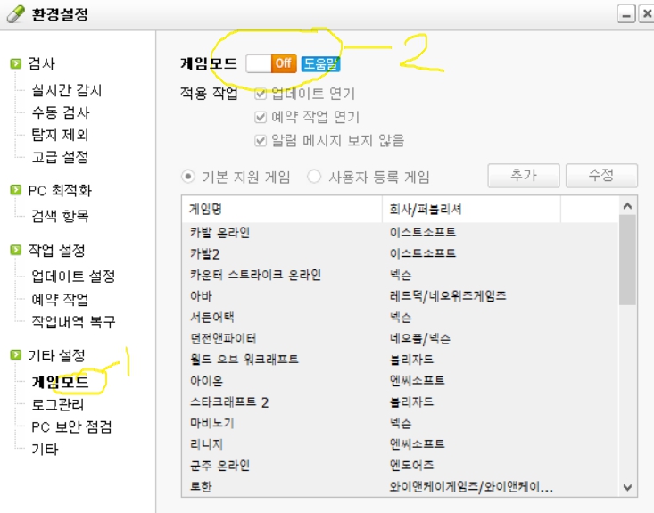 환경설정 메뉴바에서 게임모드를 눌러 주면
